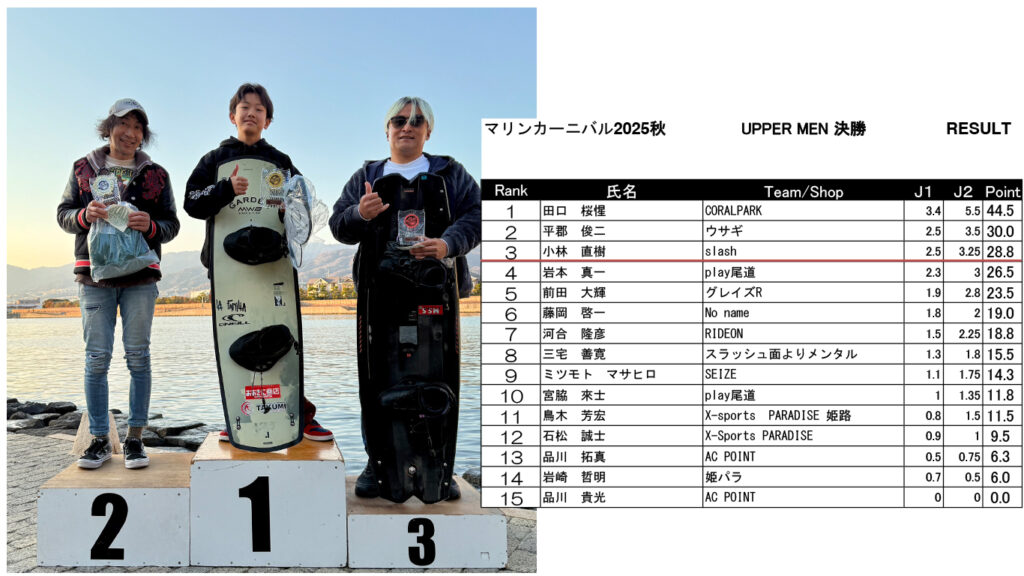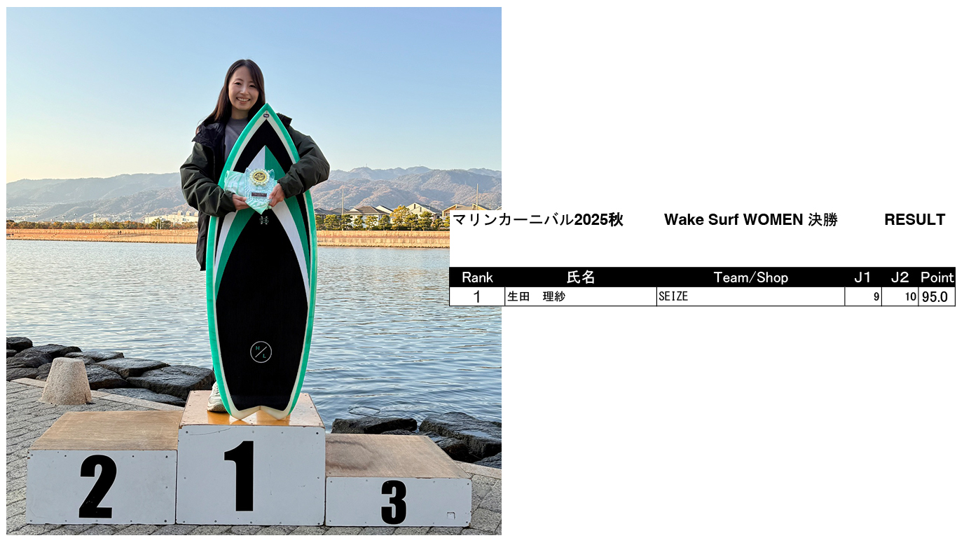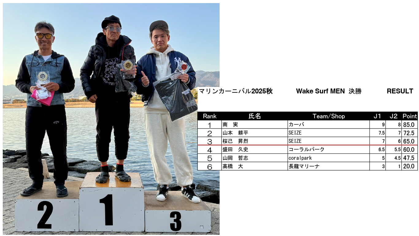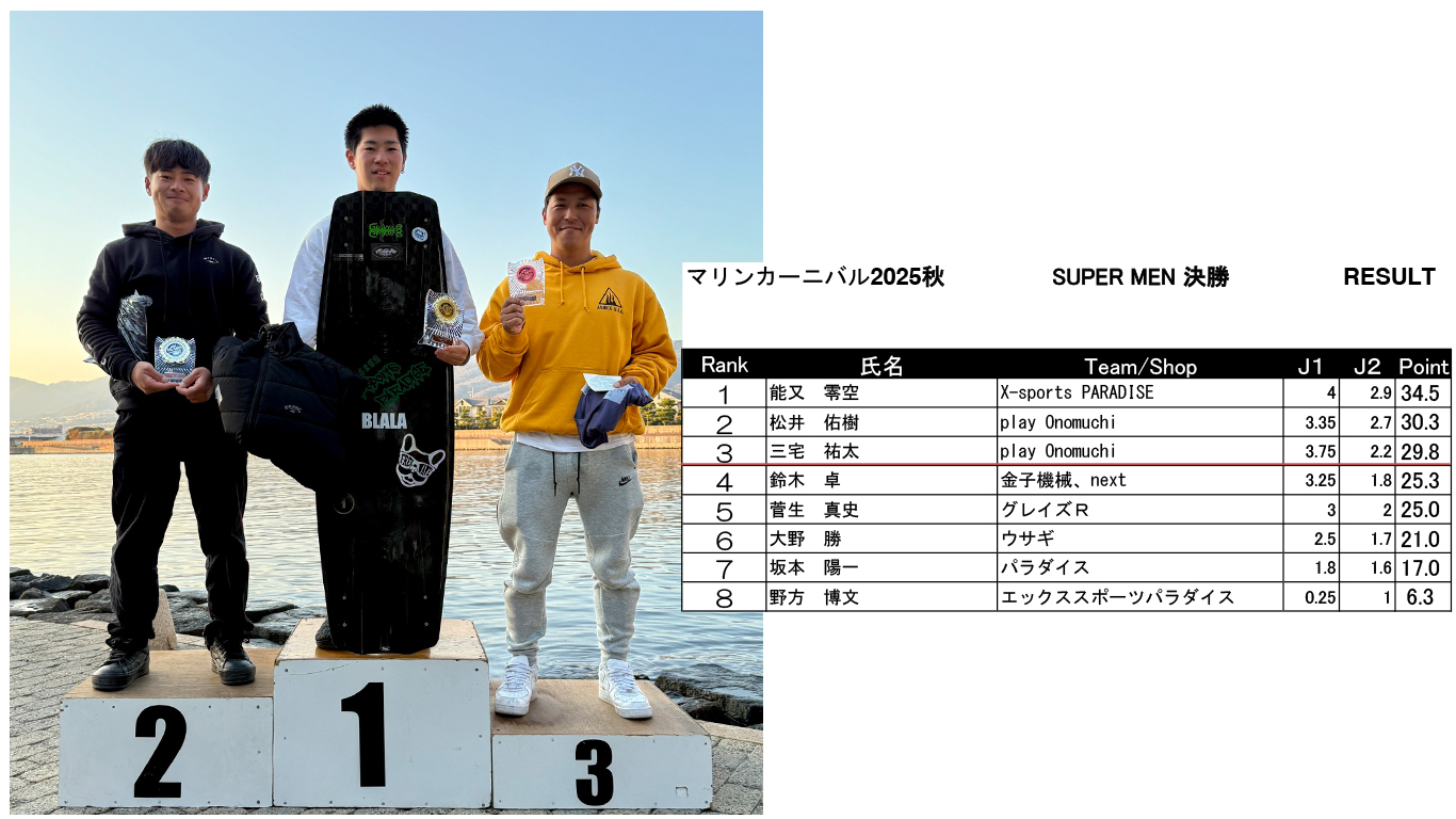 マリンカーニバル ’25 秋 リザルト発表 Marine Carnival 2025 2025.12.08 皆様2025年シーズンオフイベント「マリンカーニバル」にご参加いただきありがとうございました!リザルトはこちらになります! SUPER MEN SUPER WOMEN UPPER MEN MIDDLE MEN MIDDLE WOMEN BEGINNERS MEN BEGINNERS WOMEN SKI Wake Surf MEN Wake Surf WOMEN BEGINNERS Surf
