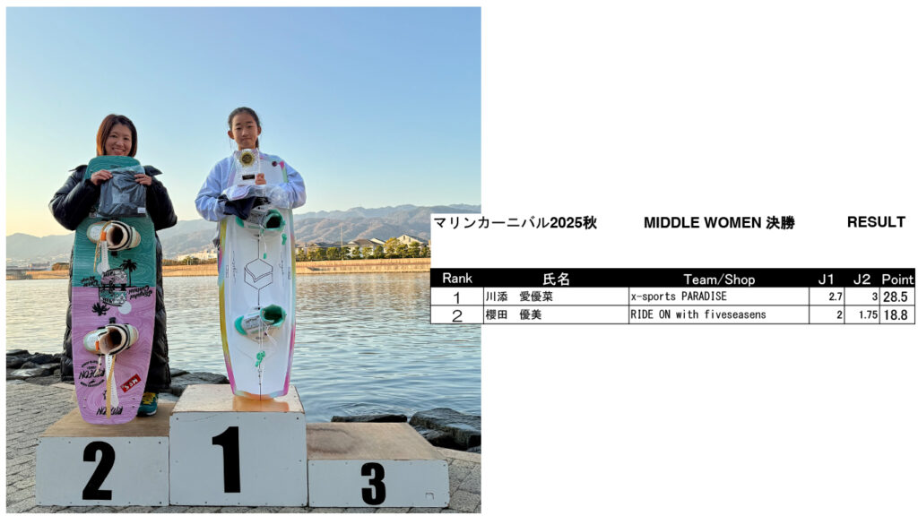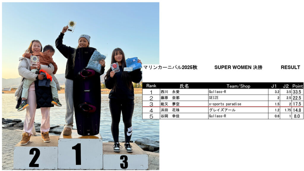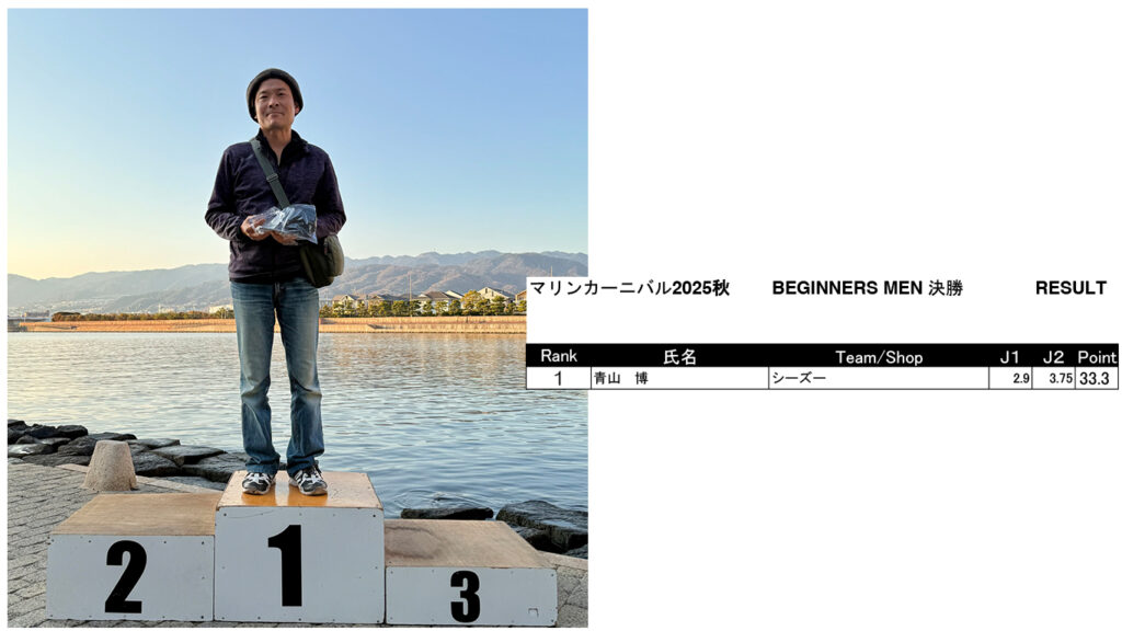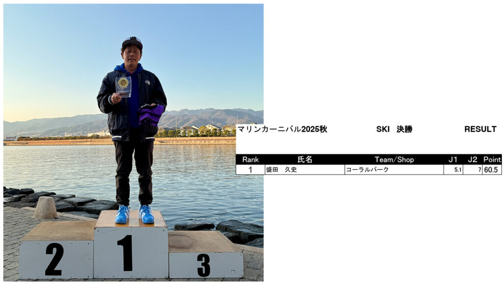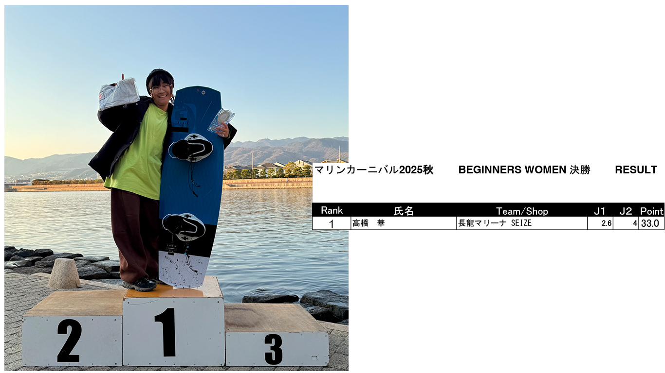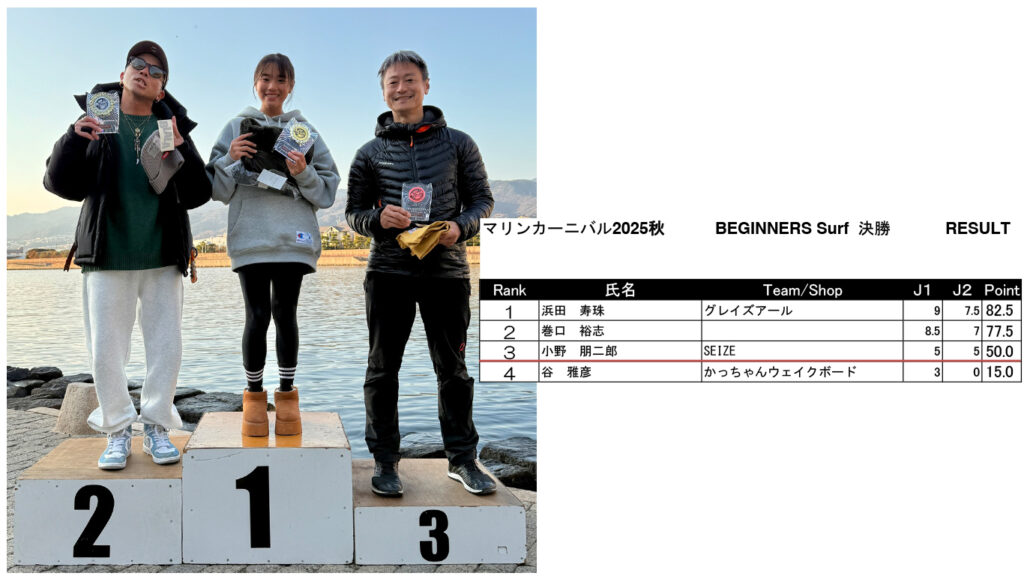 マリンカーニバル ’25 秋 リザルト発表 Marine Carnival 2025 2025.12.08 皆様2025年シーズンオフイベント「マリンカーニバル」にご参加いただきありがとうございました!リザルトはこちらになります! SUPER MEN SUPER WOMEN UPPER MEN MIDDLE MEN MIDDLE WOMEN BEGINNERS MEN BEGINNERS WOMEN SKI Wake Surf MEN Wake Surf WOMEN BEGINNERS Surf